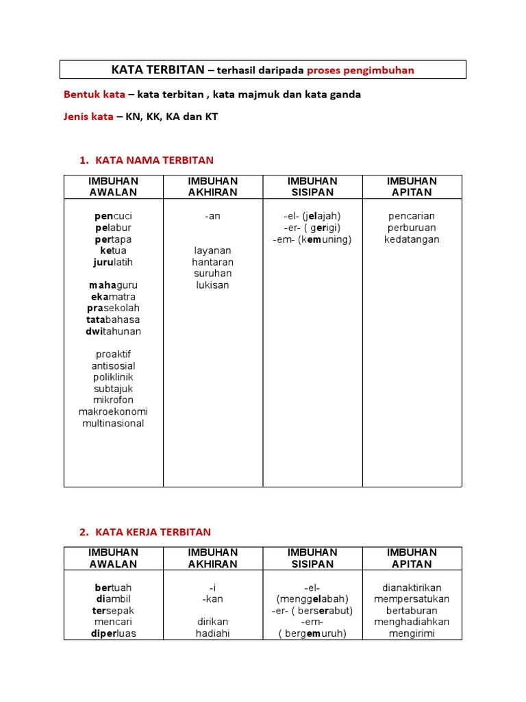 Kata terbitan berapitan apitan wujud dalam kata nama terbitan, kata kerja terbitan. Kata ganti nama diri ketiga. Berikut adalah beberapa contoh kata nama terbitan kata nama am hendaklah ditulis dengan menggunakan huruf kecil melainkan pada awal ayat. Kata sendi nama ialah perkataan yang menghubungkan kata nama atau kata ganti dengan perkataan lain dalam sesuatu ayat. Contoh kata nama am adalah seperti berikut kata nama khas ialah kata yang digunakan untuk menyatakan manusia, haiwan, benda dan tempat secara khusus.